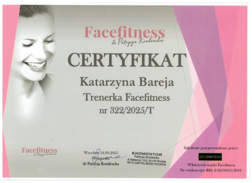 Jestem certyfikowaną instruktorką Facefitness (program stworzony przez dr Patrycję Kondracką), promotorką bezinwazyjnej pielęgnacji oraz współtwórczynią naturalnych kosmetyków marki Polny Warkocz. Wierzę w mądre działania, które w krótkim czasie przynoszą wymierne efekty i tą wiedzą dzielę się na moich zajęciach.